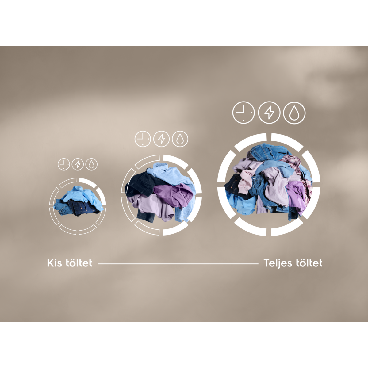 *Belső teszt alapján: időtartam, víz- és energiafogyasztás összehasonlítása 1 kg-os és maximális töltet 30 °C-os pamutprogramon történő mosása során, SensiCare technológiával.