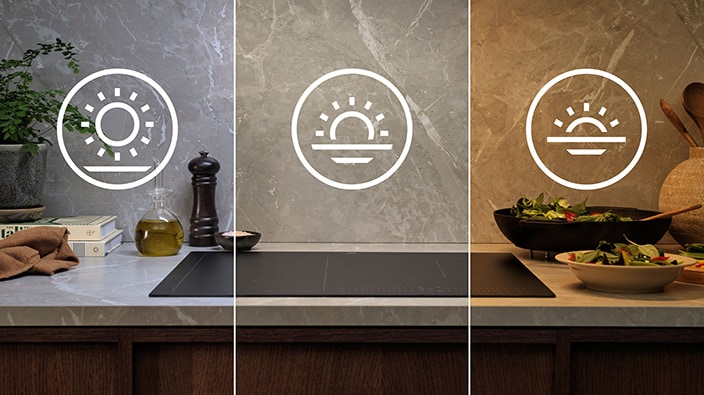 A szabályozható LED-világítás az egész főzőfelületet megvilágítja, így Ön mindig tökéletesen látja, amit készít. Állítsa be a fény intenzitását és színhőmérsékletét hidegtől melegig, hogy megtalálja az ideális kombinációt.
