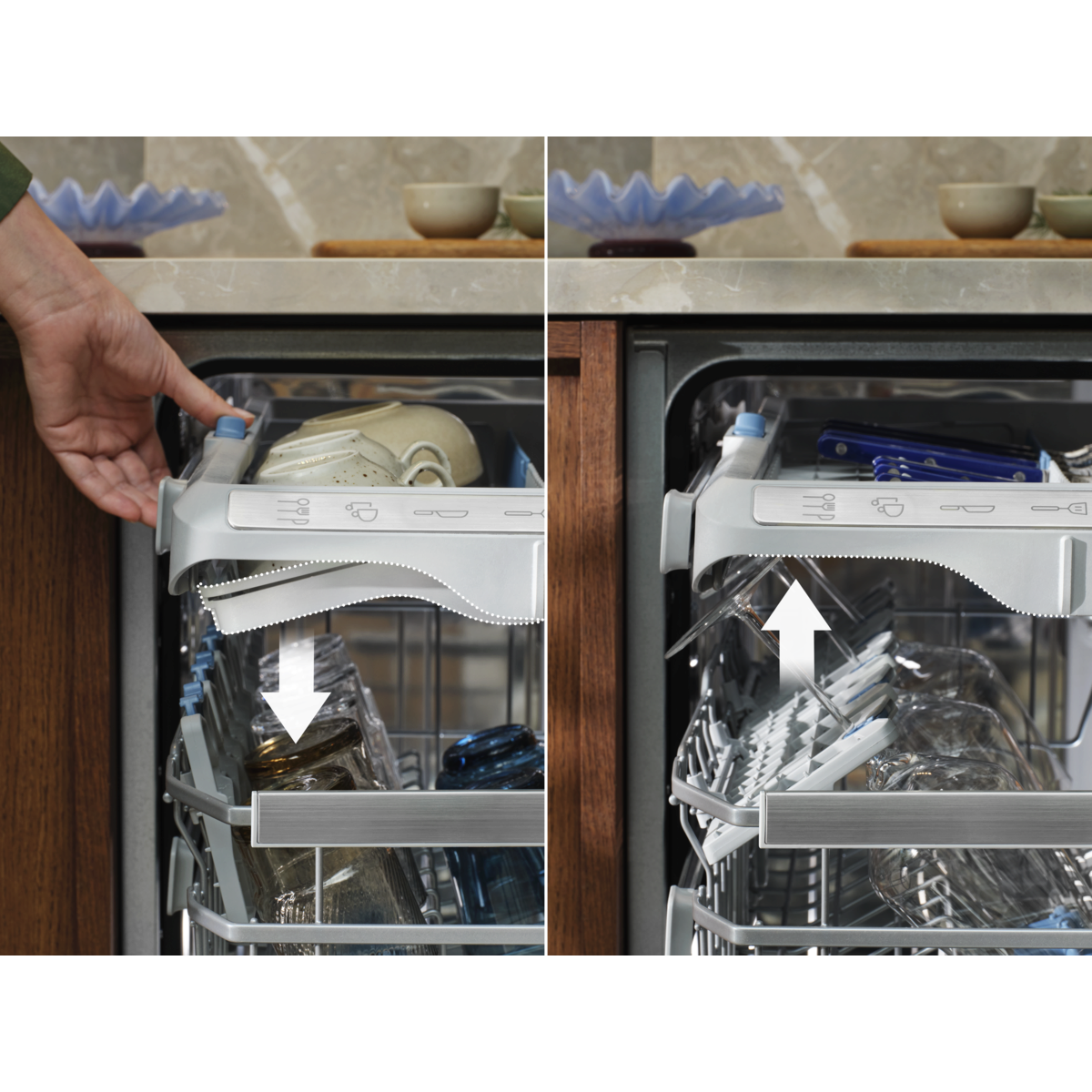 A MaxiSpace 900 belső tere 5 cm-rel magasabb, mégis illeszkedik a hagyományos konyhapultba. A tágas, sokoldalú kosarakban elférnek a kancsók, a borospoharak és a levesestálak is. Az evőeszköztartóban a kisebb csészéknek is jut hely. A makacs szennyeződéseket minimális vízhasználattal távolítja el.