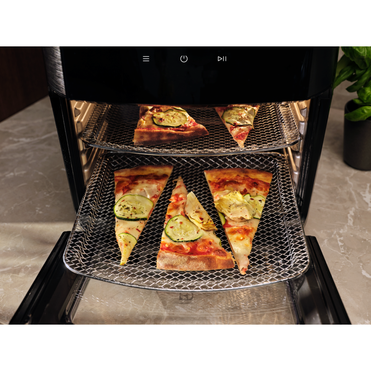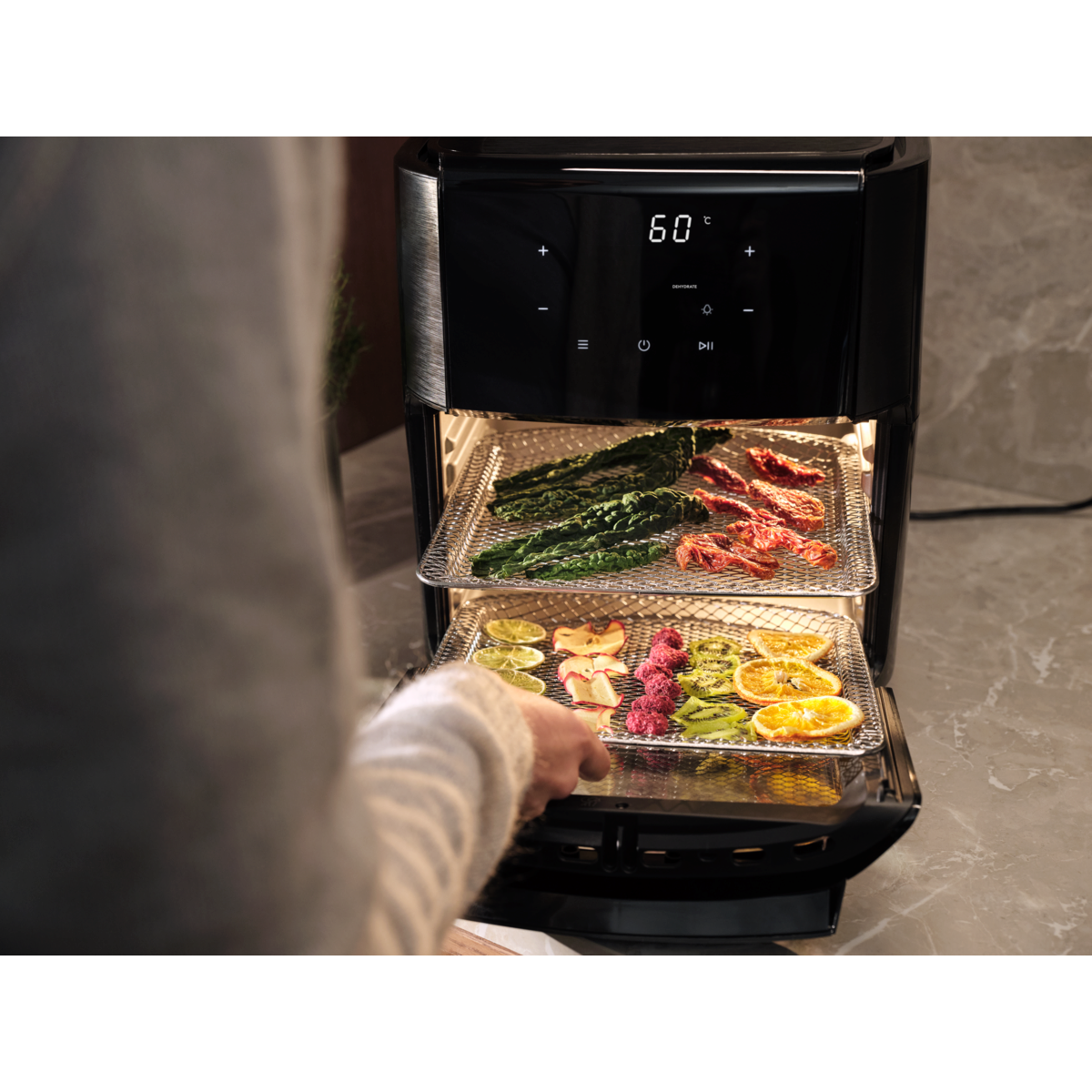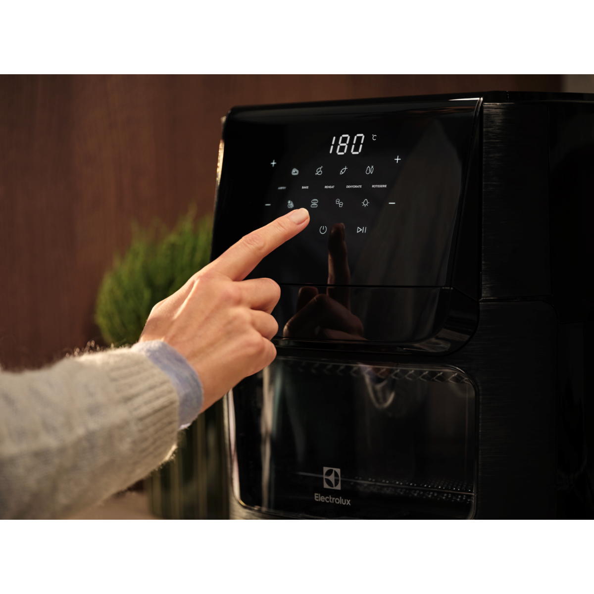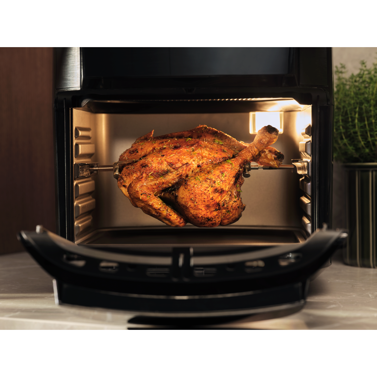 A maximálisan sokoldalú, konyhapulton elférő, 5 az 1-ben sütő elkészítési módjai: légkeveréses és normál sütés, újramelegítés, aszalás és grillezés nyárson. Nagy, 12 literes űrtartalom megfelelő a családi étkezésekhez. Az üvegajtónak köszönhetően az ételeket az ajtó kinyitása nélkül is ellenőrizheti.