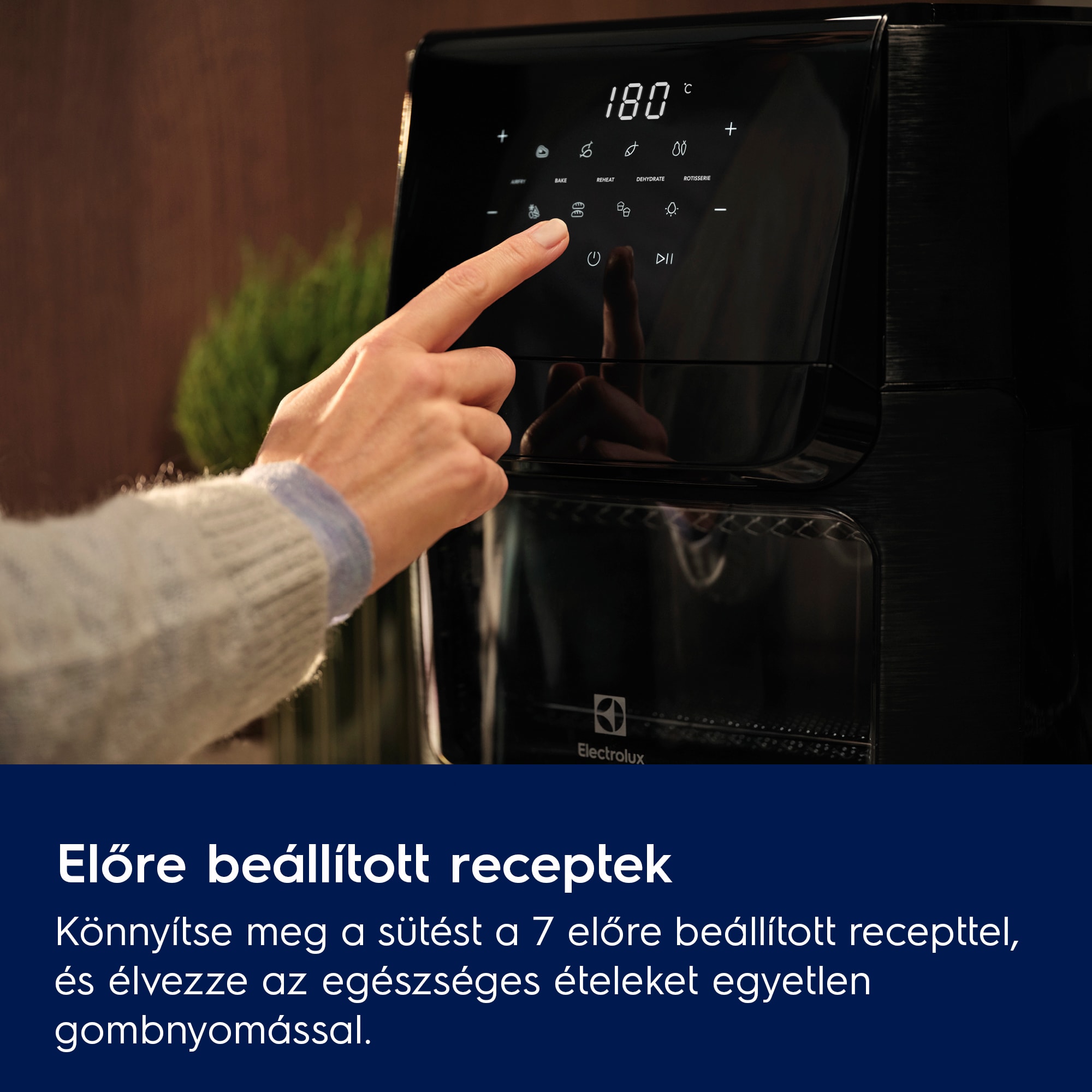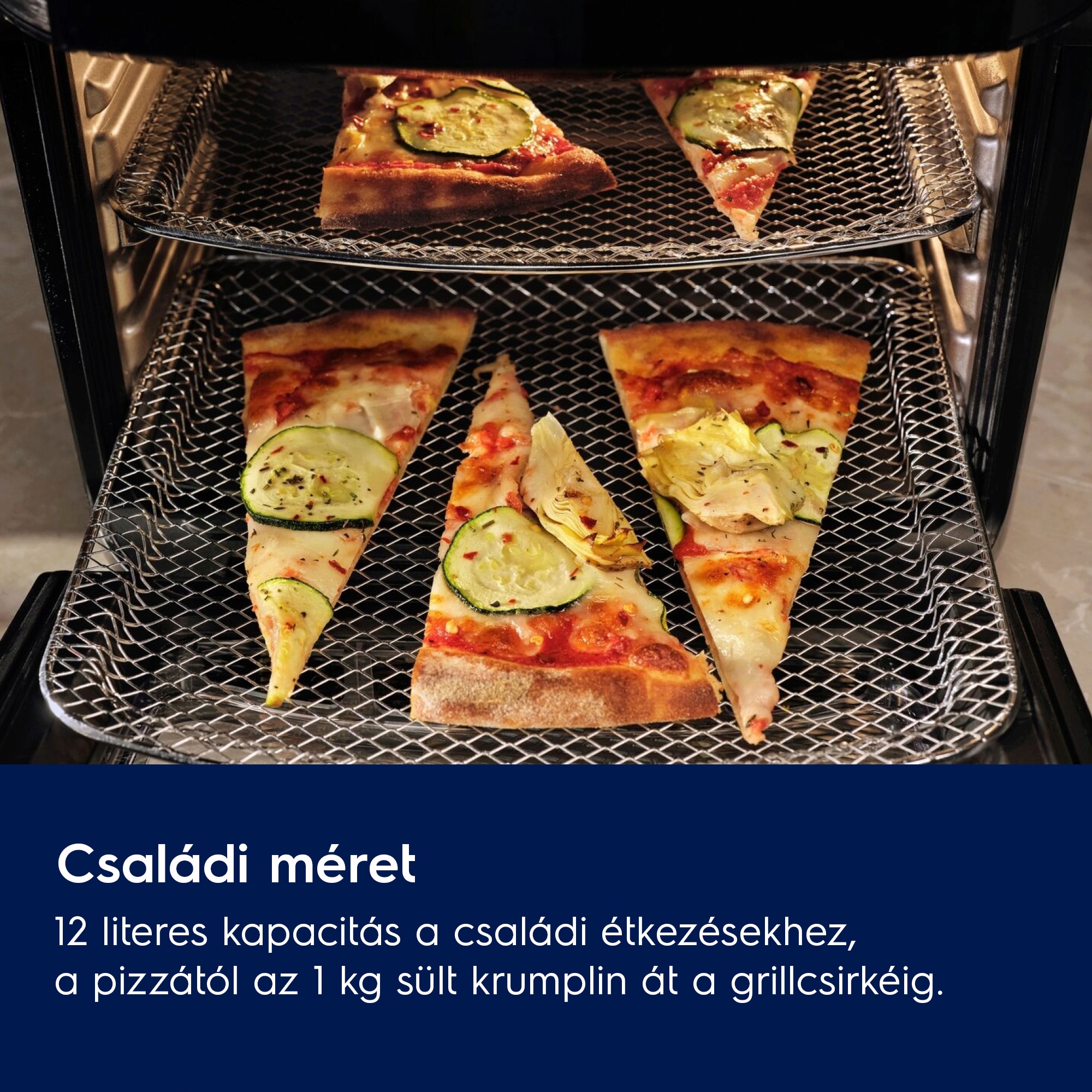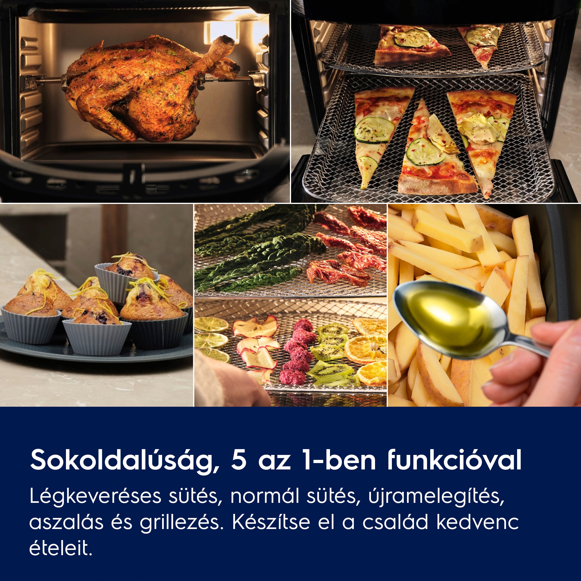 A maximálisan sokoldalú, konyhapulton elférő, 5 az 1-ben sütő elkészítési módjai: légkeveréses és normál sütés, újramelegítés, aszalás és grillezés nyárson. Nagy, 12 literes űrtartalom megfelelő a családi étkezésekhez. Az üvegajtónak köszönhetően az ételeket az ajtó kinyitása nélkül is ellenőrizheti.