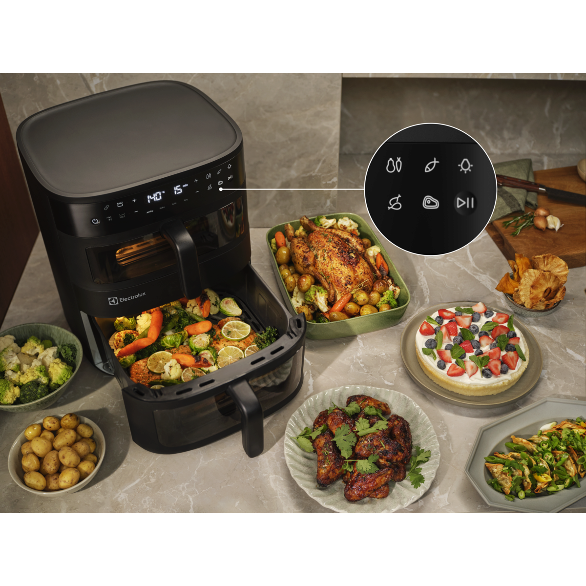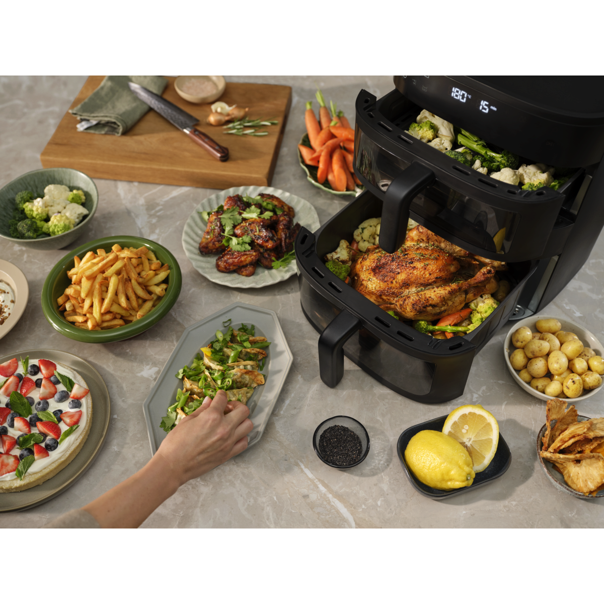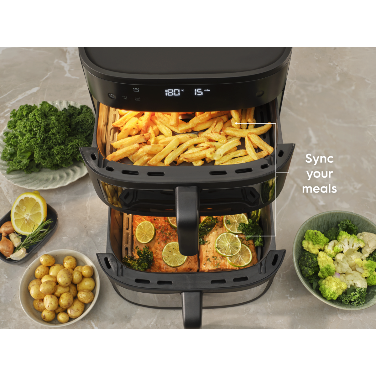 Családi adagok készítése az Electrolux 800-as Dual Air Fryerrel. A függőleges, kétkosaras kialakítással és a belső világítású betekintőablakokkal két külön ételt vagy egy nagyobb adagot is szemmel tarthat, miközben az egyenletes hőeloszlás kiváló eredményt biztosít a kompakt, helytakarékos készülékben.