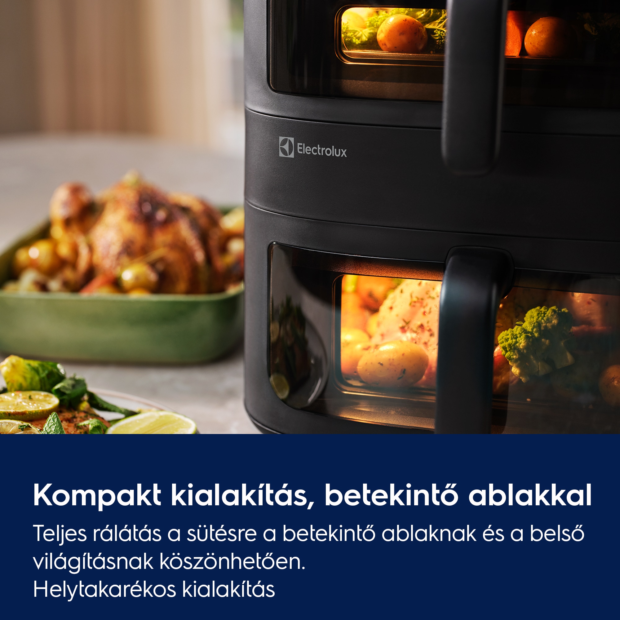 Családi adagok készítése az Electrolux 800-as Dual Air Fryerrel. A függőleges, kétkosaras kialakítással és a belső világítású betekintőablakokkal két külön ételt vagy egy nagyobb adagot is szemmel tarthat, miközben az egyenletes hőeloszlás kiváló eredményt biztosít a kompakt, helytakarékos készülékben.