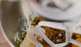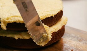 A vajat egy Assistent PRO robotgép segítségével elkeverjük a porcukorral, a mascarpone-val és a kihűlt narancskrémmel, majd kb. a felét az egyik lapra kenjük. Erre kerül a másik tésztakorong, majd a tetejét és az oldalát is megkenjük a maradék krémmel.