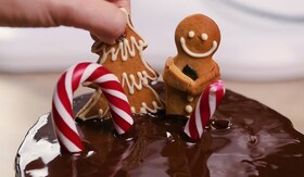 A csokit vízgőz fölött felolvasztjuk (ezt indukciós főzőlapon, nagyon alacsony hőfokon gőzfürdő nélkül is megtehetjük). Hozzácsorgatjuk az olajat, nyomózsákba töltjük, és kidíszítjük vele a torta tetejét. Végül pár mézeskalácsot szúrunk a tortába.