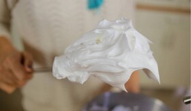 3 tojásfehérje, 3 ek. víz, 15 dkg porcukor, 1 ek. kukoricakeményítő, 2,5 dl habtejszín, 1 ek. porcukor, 1 érett mangó, ízlés szerint 1 maracuja