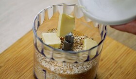 A morzsához a zabpelyhet, a darált mandulát és a barnacukort egy aprítóban összekeverjük, majd belerakjuk a vajat és újra átkeverjük.