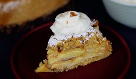 Az almákat meghámozzuk, kivágjuk a magházakat, és 3-4 mm vékony szeletekre vágjuk. A tészta harmadát belesimítjuk a 18 cm átmérőjű, kapcsos tortaforma aljába. A morzsára teszünk egy réteg almaszeletet, meghintjük fahéjjal, majd rámorzsolunk egy kis karamellát. Folytatjuk a rétegezést addig, amíg felhasználjuk a hozzávalókat. A maradék morzsával betakarjuk a torta tetejét, megszórjuk a megmaradt karamellával és leöntjük a tejszínnel.