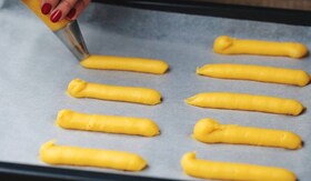 A simára kevert masszát nyomózsákba töltjük és sütőpapíros tepsire kb. 9-10 cm-es csíkokat nyomunk 3 ujjnyi távolságra egymástól. 200 fokon, közepes páratartalmú gőzprogramon megsütjük őket kb. 20 perc alatt, majd kikapcsoljuk a sütőt és egy fakanál nyelével kitámasztva, hagyjuk, hogy kihűljenek.