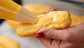 A krémhez a tojássárgákat elkeverjük a porcukorral és a liszttel, majd apránként, folyamatos keverés mellett felöntjük a tejjel és a tojáslikőrrel. Közepes lángon, kevergetve puding állagúra sűrítjük és lehűtjük. Mikor kihűlt belekeverjük a vajat, nyomózsákba töltjük és megtöltjük vele az eclair fánkok belsejét.