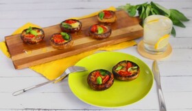Sózzuk és borsozzuk, majd pár vékony szelet fokhagymát, kevés kakukkfüvet és egy kis apróra vágott rozmaringot szórunk rájuk. Egy nagyobb mozzarellát kis darabokra tépünk, és beletöltjük a gombákba. Elnegyedelünk néhány koktélparadicsomot, és a mozzarellára tesszük őket.