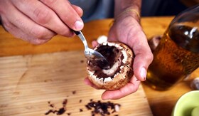 Kitörjük néhány nagyobb méretű gomba szár részét. Körben megtisztítjuk őket, és egy kiskanállal kikaparjuk a belsejüket. Így jó sok töltelék el fog férni bennük.