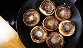 Egy serpenyőt indukciós főzőlapon, magas hőfokon felforrósítunk, és megpirítjuk a gombákat: először az üreges részükkel lefelé, majd a másik oldalukat is.
