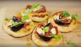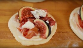Pár szem érett fügéből vékony gerezdeket vágunk és minden pizzára ráteszünk 2-2 darabot, végül pedig lágy kecskesajtot morzsolunk a tetejükre. Egy száraz serpenyőt forróra hevítünk, beleszórunk egy kevés lisztet és a pizzákat sütni kezdjük benne. Amikor az aljuk épp egy kis színt kap, a serpenyőt forró sütőbe tesszük. Lehetőleg enyhén gőzpárás sütőtérben, 270 fokon pár perc alatt készre sütjük a pizzákat. Tetejükre egy kevés friss rukkolát teszünk, meglocsoljuk extra szűz olívaolajjal és forrón kínáljuk.