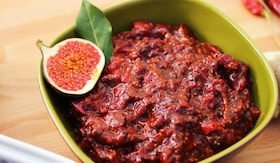 A lilahagymát félfőre (azaz félbe, majd vékony szeletekre) vágjuk és közepesen forró serpenyőben, olajon párolni kezdjük. Aprítógépben durvára aprítjuk az aszalt szilvát, a friss gyömbért és a chilipaprikát, majd az így kapott keveréket is a hagymához adjuk. A fügét és a kimagozott szilvát negyedekbe vágjuk, és ezeket is a serpenyőbe dobjuk. Őrölt korianderrel, fahéjjal, babérlevéllel, nádcukorral és kevés sóval ízesítjük, majd hozzáadjuk a fehérbort és a borecetet.