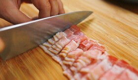 A bacon-t vékony csíkokra vágjuk. Egy indukciós főzőlapon közepes hőfokozaton, száraz serpenyőben kevergetve, pár perc alatt kisütjük belőle a zsírt. A vöröshagymát felaprítjuk, és a bacon zsírján lepirítjuk. A burgonyát vékonyabb szeletekre vágjuk, sózzuk, borsozzuk.