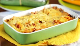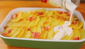 Egy sütőtálba teszünk egy réteg burgonyát, megszórjuk kevés hagymával és bacon-nel, majd jön rá egy újabb sor burgonya, hagyma, bacon. Végül burgonyaréteggel zárjuk a sort, amit megszórunk a maradék pirított bacon-nel és hagymával.