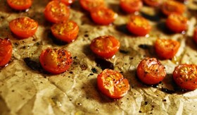 Az édesburgonyát kisebb kockára vágjuk, majd egy sütőpapírral bélelt tepsire szórjuk. Meglocsoljuk olívaolajjal, megszórjuk sóval és törött borssal. A koktélparadicsomokat félbevágjuk, elrendezzük a tepsin, és kevés olívaolajjal, balzsamecettel, durva szemű sóval és feketeborssal ízesítjük. Az édesburgonyát és a paradicsomot betesszük a sütőbe, és 200 fokon, 15 perc alatt megsütjük.