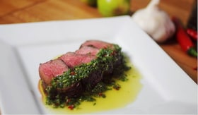 A forró, szaftos, közepesen átsült sült húst felszeleteljük, tányérra helyezzük, és gazdagon megöntözzük a chimichurri mártással.