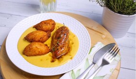 A sütőből kivett húst alufóliába csomagolva pihentetjük 5 percig, majd a serpenyőnket újra felmelegítve megolvasztjuk benne a vajat, beledobjuk a kakukkfüvet, és jöhetnek a mellek a kevés kifolyt szafttal együtt. Rádobjuk még a vajra a mézet is, és a melleket megfürdetjük-locsolgatjuk a vajas mézben, épp csak addig, míg szép aranyszínű csillogó mázat kapnak. Tálaláskor a mustáros mártásra helyezzük a szaftos mézes csirkét, és jó sok burgonyafánkot pakolunk mellé.