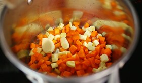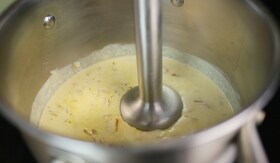 Hozzáadunk 1 dl vizet is, és a zöldségeket addig főzzük benne, míg a folyadék elpárolog. Felöntjük a tejszínnel, és 5 percig forraljuk kis lángon, majd félretesszük egy kicsit lehűlni. Turmixgéppel vagy botmixerrel az egészet szép krémesre pürésítjük, és annyi vizet adunk még hozzá, hogy selymes mártás állagot kapjunk. Sóval, borssal és kevés mustárral ízesítjük, ha még szükséges.