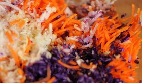 A káposztákat kisebb darabokra vágjuk, majd a sárgarépát, a sörretket és a hónapos retket megpucoljuk. Egy szeletelőgép segítségével az összes zöldségfélét finomra reszeljük, majd az egészet egy tálba borítjuk.