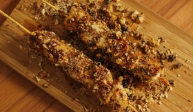 A kockára vágott csirkemellet bambusznyársakra húzzuk, és sóval, borssal, szerecsendió-virággal ízesítjük. Serpenyőben olajat hevítünk, és aranyszínűre sütjük a csirkemellet. Ráöntünk egy kevés juharszirupot, melytől vékony karamellizált bevonat képződik a húskockákon. A kész nyársakat megforgatjuk pirított dióban, majd tányérra kanalazott salátahalmok tetejére helyezve tálaljuk.