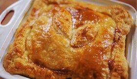 A serpenyőben felhevítjük a maradék kacsazsírt, majd a paradicsompürét lepirítjuk benne. Megszórjuk a liszttel, kicsit tovább pirítjuk, majd felöntjük az alaplével, és addig forraljuk, míg szép sűrű pecsenyelevet kapunk. A szafttal meglocsoljuk a kacsaragut, végül pedig az egészet lefedjük egy megfelelő méretűre vágott tésztalappal. A két tésztaréteget egy villával alaposan összetapasztjuk, a pite tetejére pedig tésztából kivágott levéldíszt teszünk. A pitét megkenjük felvert tojással, majd 180 fokon kb. 30 perc alatt készre sütjük.