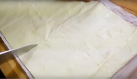 A vajas levelestésztát kiterítjük, és akkora darabot vágunk belőle, amellyel ki tudjuk bélelni pitesütő formánkat. A tésztát óvatosan eligazítjuk az edény alján és oldalán, majd a felesleges kilógó részeket eltávolítjuk (késsel a legegyszerűbb). A kacsaragut a formába kanalazzuk, és egy kanállal finoman letömörítjük.