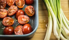 1 fürt édes koktélparadicsomot félbevágunk, egy kis sütőtálba rakjuk őket, meglocsoljuk 2 evőkanál olívaolajjal, megszórjuk egy csipet sóval és borssal, majd 200 °C-ra előmelegített sütőbe tesszük őket.