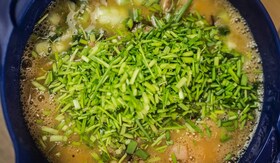 Az előzőleg megfonnyasztott újhagymát és pirított sonkát a tojásokhoz adjuk. 1 nagy csokor metélőhagymát felaprítunk, és 3 evőkanálnyi frissen reszelt tormával együtt a tojásokhoz adjuk. 2 evőkanálnyi parmezánt szintén a tojásokhoz adunk, és lazán elkeverjük őket.