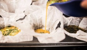 Egy muffinsütő forma méretű sütőpapírt kissé összegyűrünk, 12 db egyenlő nagyságú darabot vágunk belőle, és a forma mindegyik mélyedésébe egyet-egyet belenyomkodunk. A sütőpapírral bélelt formákba öntjük az alapot, majd a sütőből kivett paradicsomokból egy-egy fél szemet teszünk a készülő frittatákra. Visszarakjuk őket a sütőbe kb. 10-12 percre, amíg kellően megszilárdulnak.
