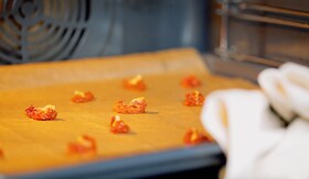 A paradicsomokat negyedeljük és 80 fokos sütőben