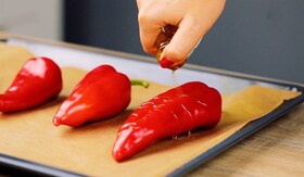 A paprikákat sütőpapírral borított tepsire rakjuk, meglocsoljuk kevés olívaolajjal és 200 fokos sütőben