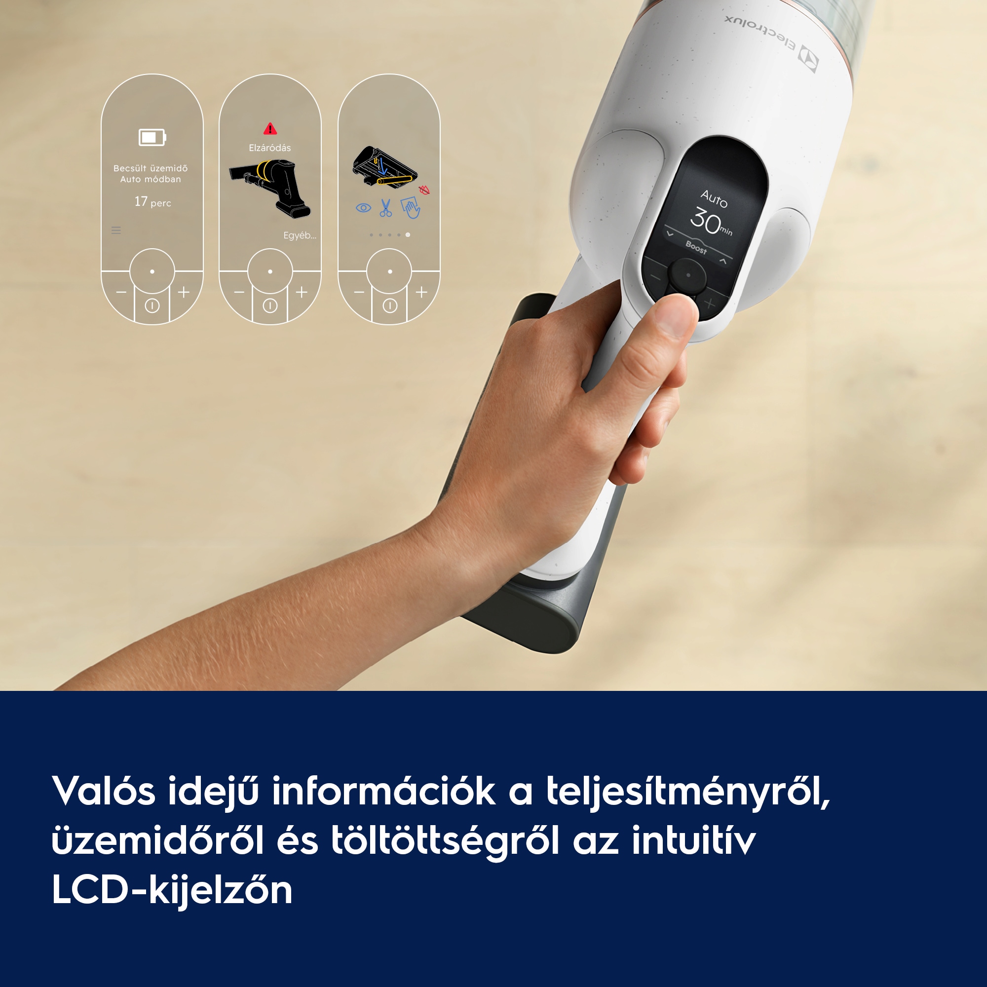 Az Electrolux 900-as vezeték nélküli porszívó intuitív LCD kijelzője megjeleníti a legfontosabb információkat, mint például a teljesítményfokozat, a hátralévő üzemidő és a töltöttségi szint. Emellett karbantartási útmutatást is ad a tartós teljesítmény és hosszú élettartam érdekében.