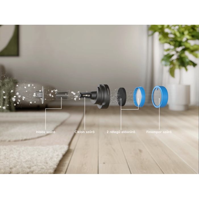 *A korábbi 600-as vezeték nélküli porszívóhoz képest mérve, DMT (szabványos teszt) porral töltött portartállyal, az IEC 62885-4 szabvány szerint.