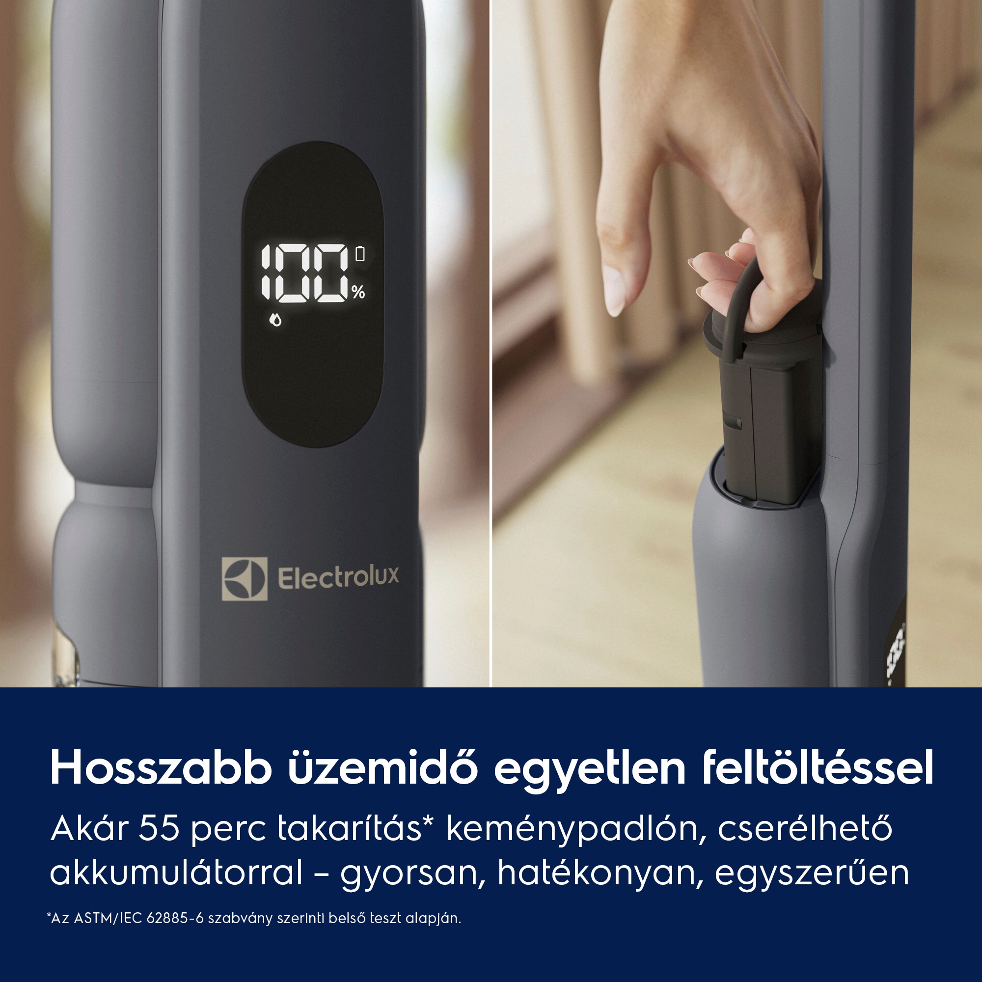 Akár 55 perces* üzemidő keménypadlón és cserélhető akkumulátor
